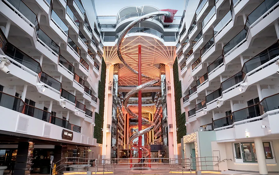 MSC World Europa to statek, który zerwał z tradycyjną sylwetką wycieczkowców. Jego najbardziej rozpoznawalnym elementem jest World Promenade – otwarta promenada o długości 104 metrów, zwieńczona zapierającym dech w piersiach widokiem na rufę. Nad promenadą góruje The Venom Drop @ The Spiral – najdłuższa sucha zjeżdżalnia na morzu, wykonana ze stali nierdzewnej, która ciągnie się przez 11 pokładów. Architektura statku została zaprojektowana tak, aby zminimalizować opory powietrza, co w połączeniu z napędem LNG czyni go jedną z najbardziej ekologicznych jednostek tej klasy.